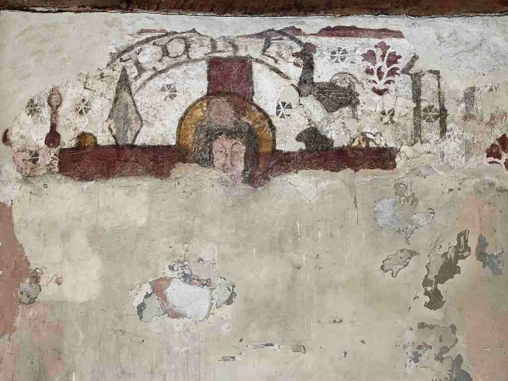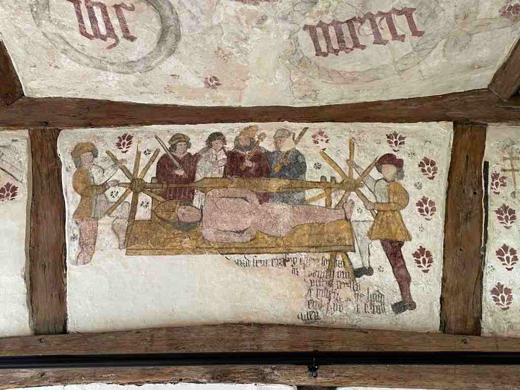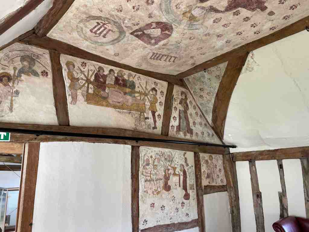 The Painted Chamber, thought to have been either a sickroom or a private space for prayer, is particularly evocative. Its medieval wall paintings, created in the late 15th century, served as vivid reminders of the glory of God and were intended to inspire prayer and reflection. Figures such as St. Erasmus (the patron saint of abdominal pain) and St. Thomas à Becket (patron saint of priests) appear alongside scenes of the Crucifixion and Archangel Michael weighing souls — imagery rich in spiritual significance. On the ceiling, a striking depiction of the Holy Trinity offered comfort to those lying in the room below, gazing upward in contemplation and hope.