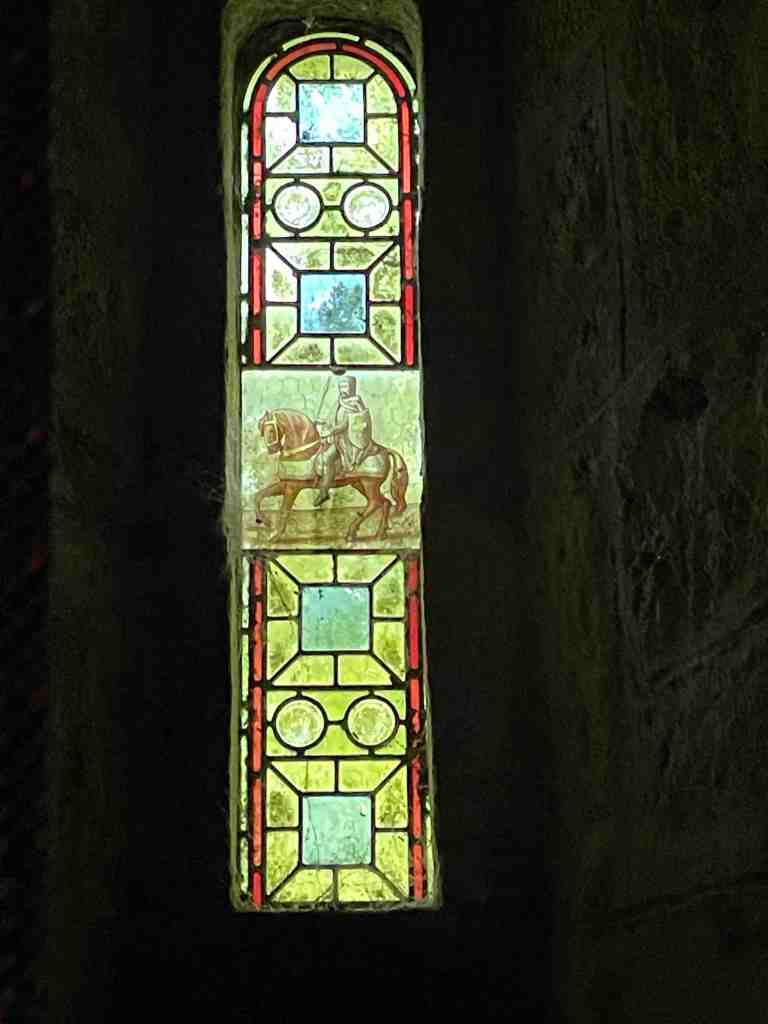- A small north-facing window in the tower contains a carving of a mounted Knight Templar
